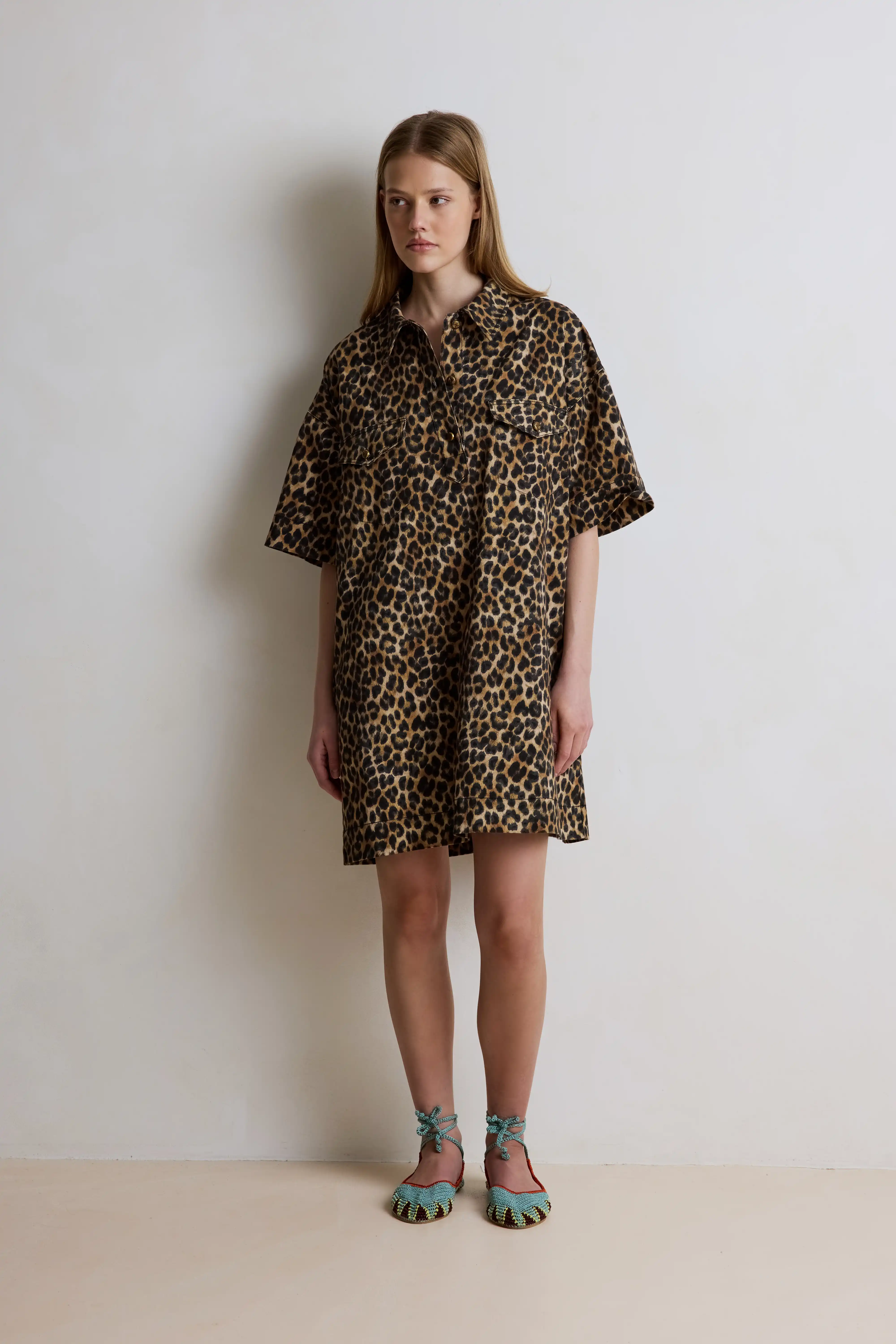 Il s'agit d'une robe droite. Son col est chemise et boutonnée jusqu'a mi poitrine. Ses manches sont 3/4 et se retroussent très facilement pour un look plus casual. Elle possède deux poches plaquées au niveau de la poitrine et deux poches latérales.