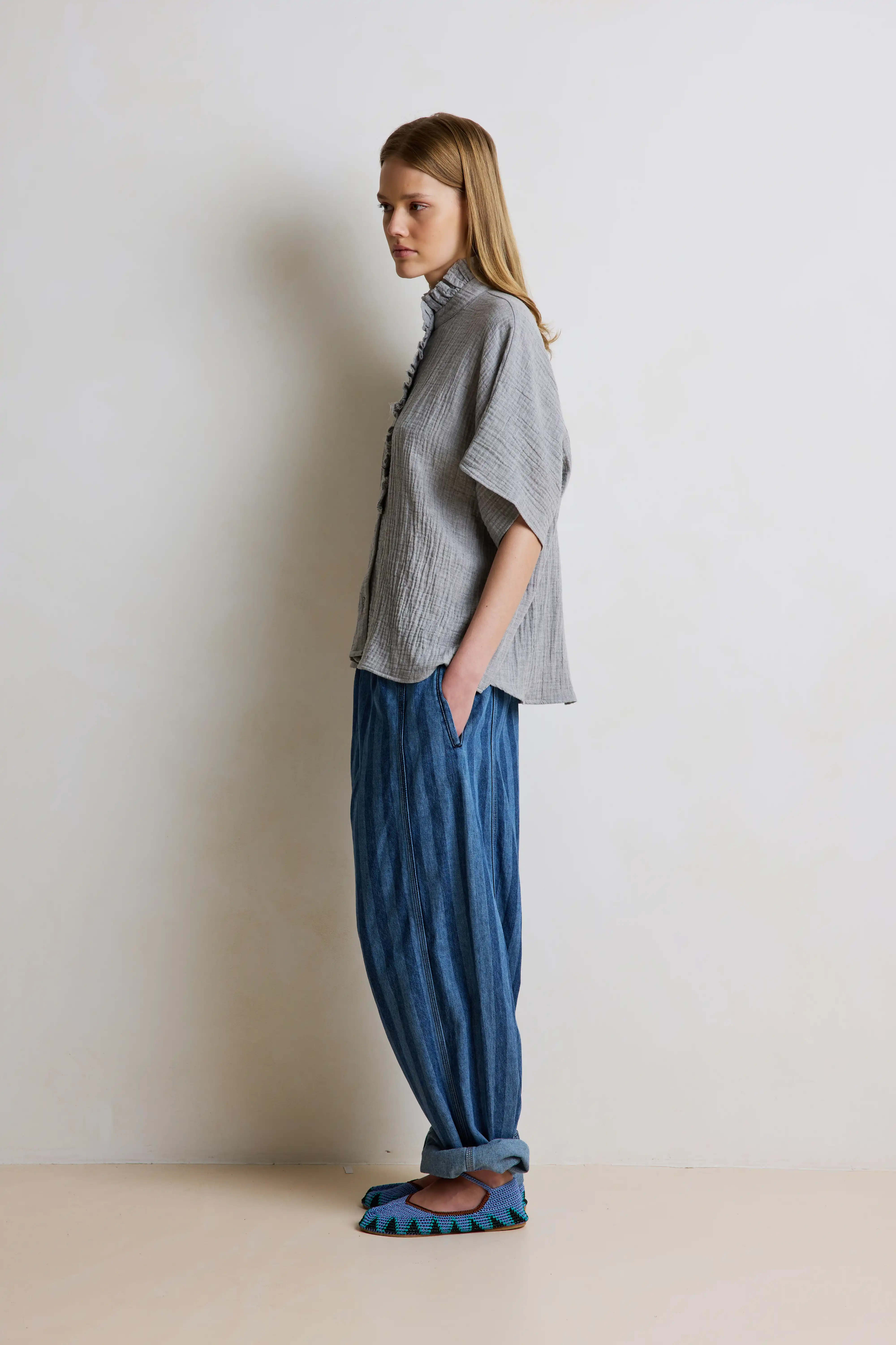 Natasha est une chemisette aux manches courtes possédant un joli détail "froufrou" à la boutonnière et au col. Sa coupe est oversize.