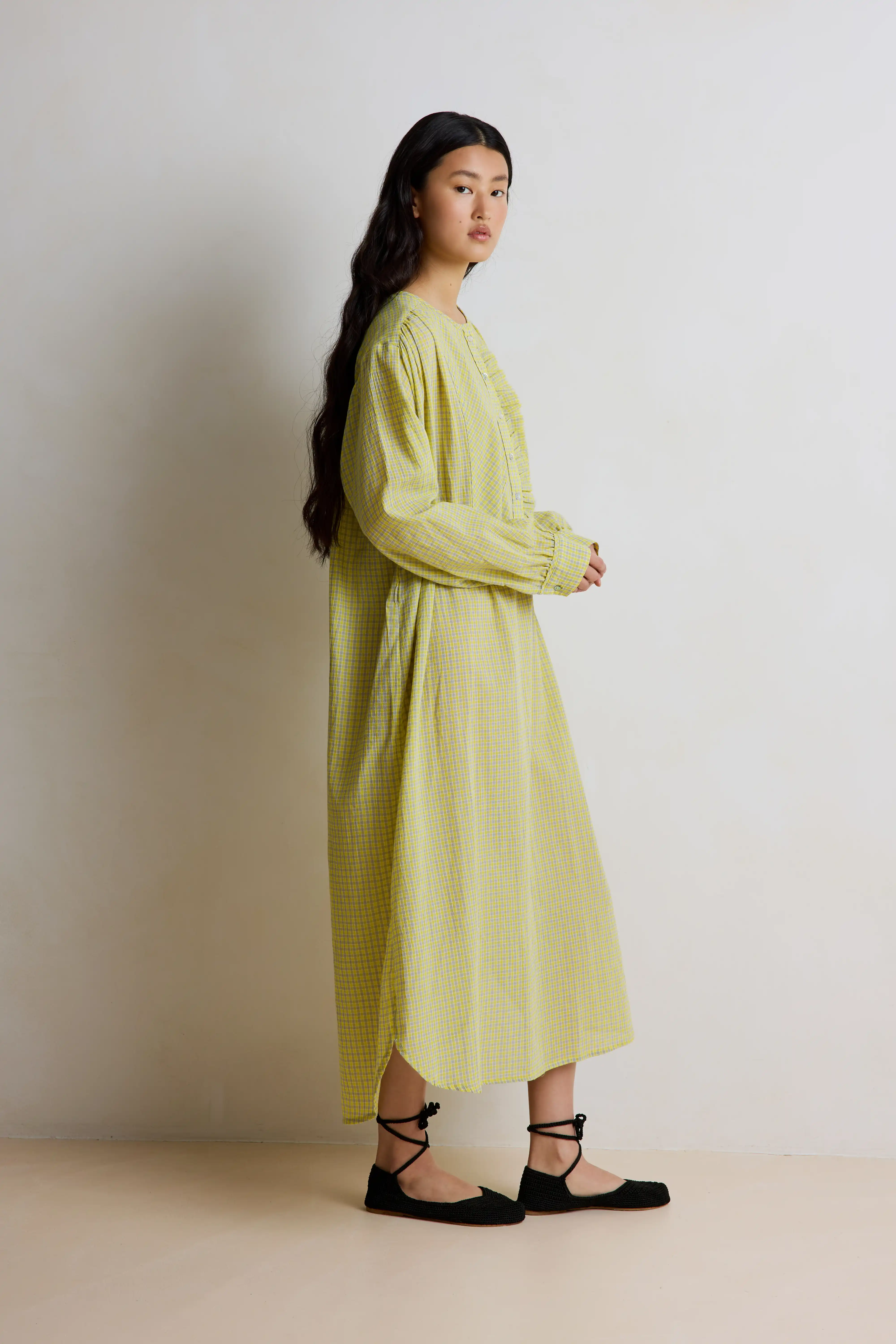 Notre robe Sally est une robe longue aux manches longues. Elle sera votre indispensable de la mi saison. Son col est rond et possède une patte de boutonnage ornée de petits froufrous.
