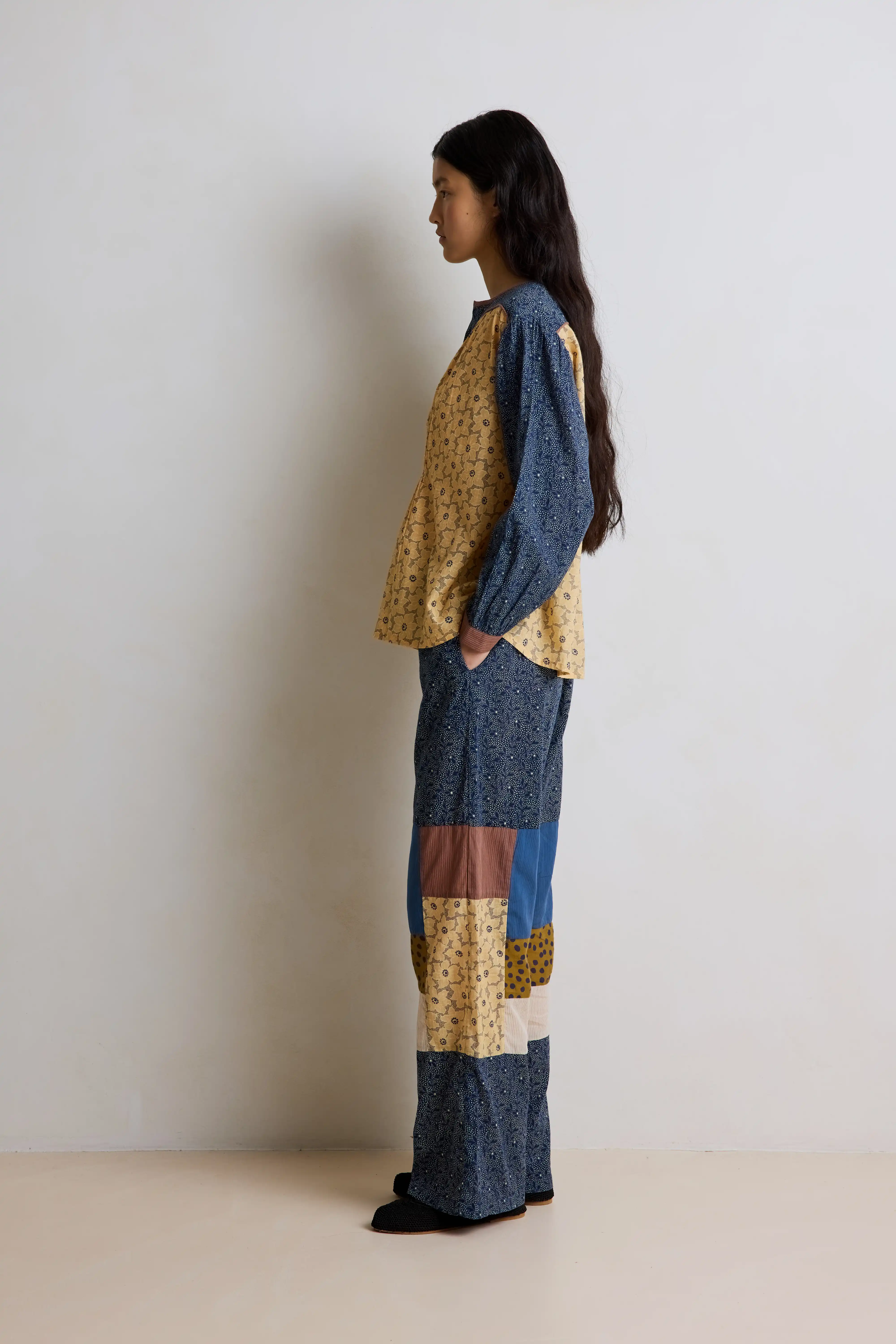 Marika est une jolie blouse manches longues. Son col est mao, elle possède des boutons jusqu'à mi poitrine. Elle est faite en patchwork de trois tissus.