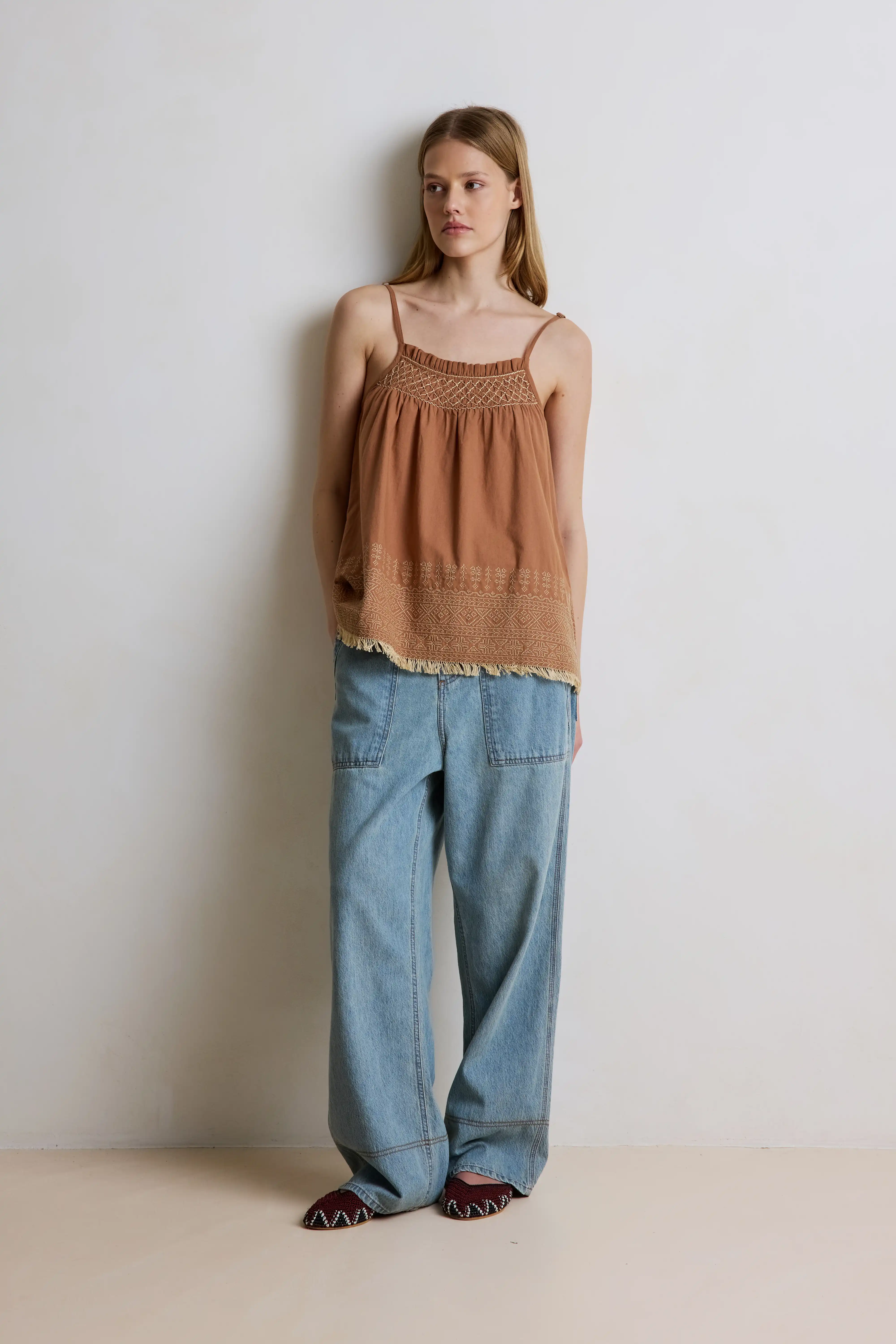 LEXA est le petit frère de la robe Lexima. Ses fines bretelles sont ajustables. Il possède une coupe large. Il possède également de jolis détails de broderies au niveau de la poitrine ainsi que sur le bas du top.