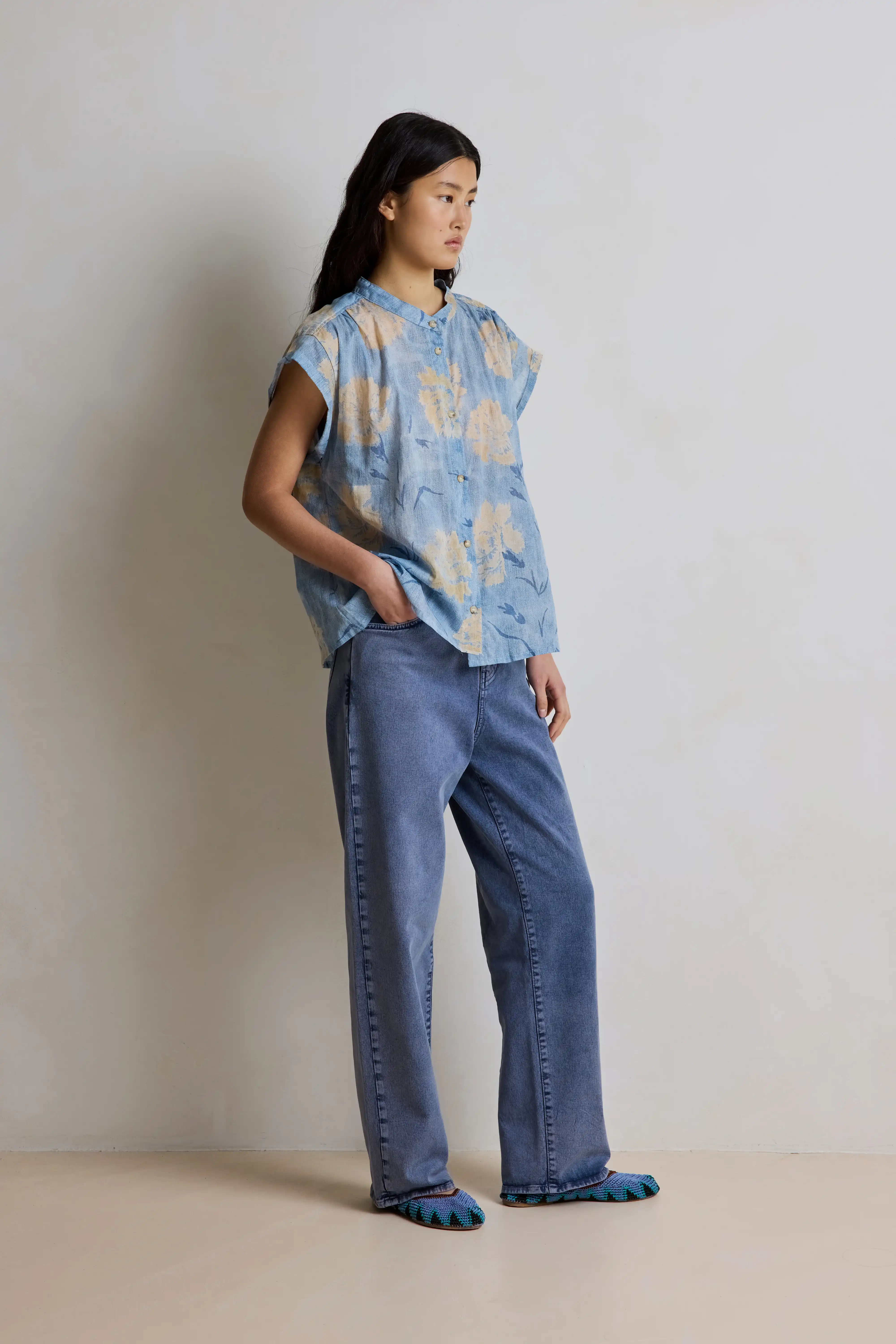 Amandine est une très jolie chemise sans manche à col rond. Entièrement boutonnée, elle possède une coupe droite légèrement oversize.